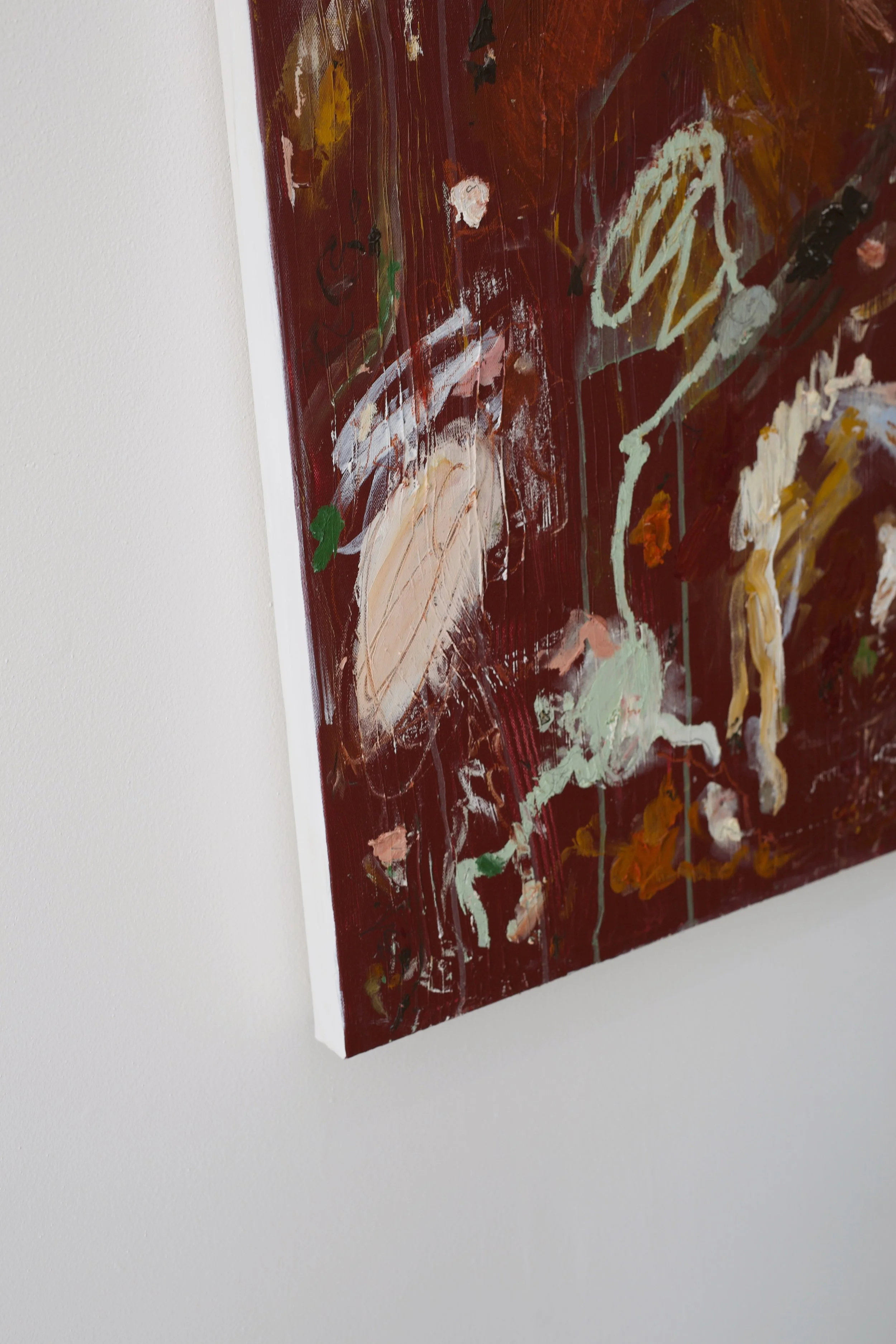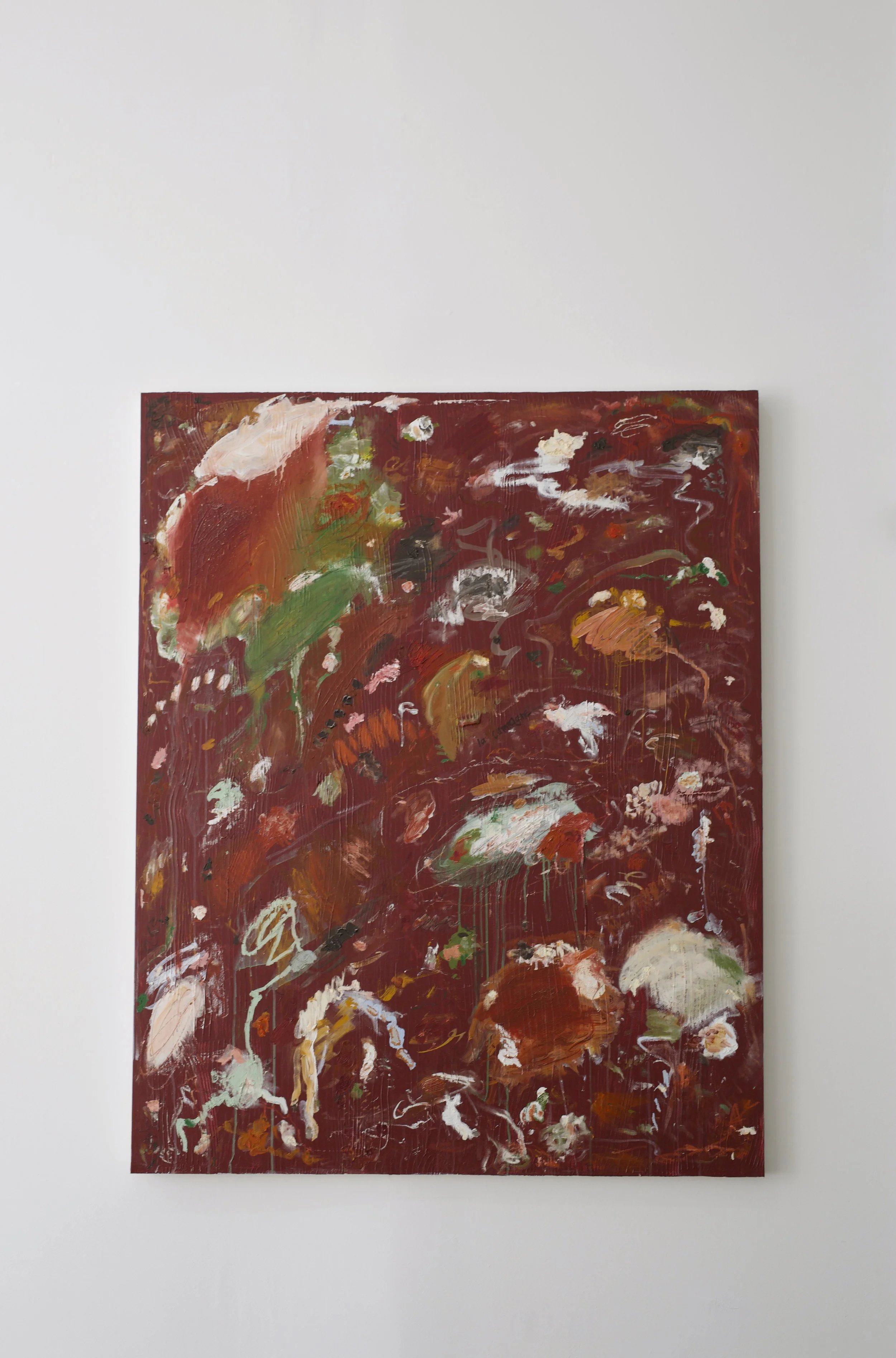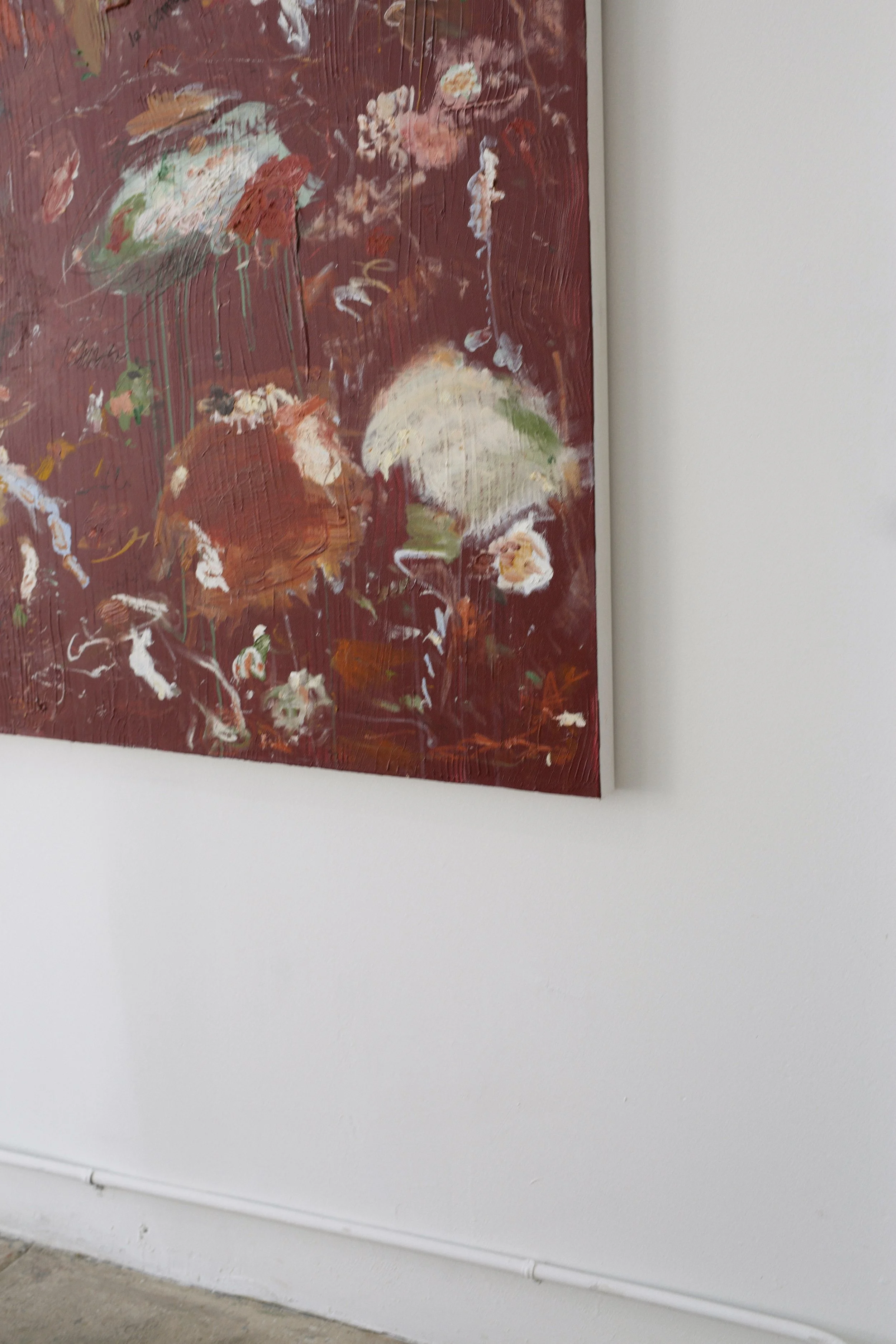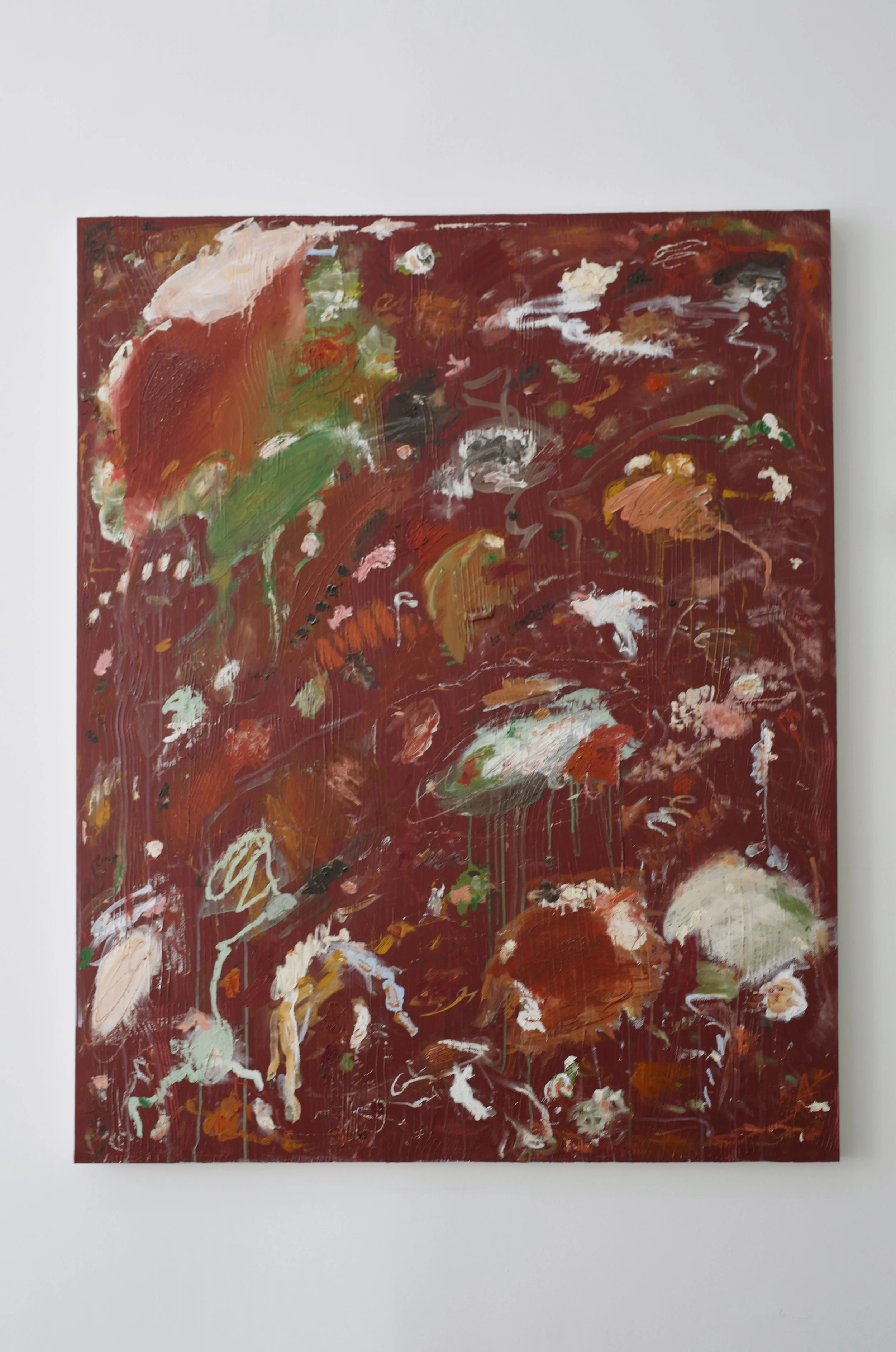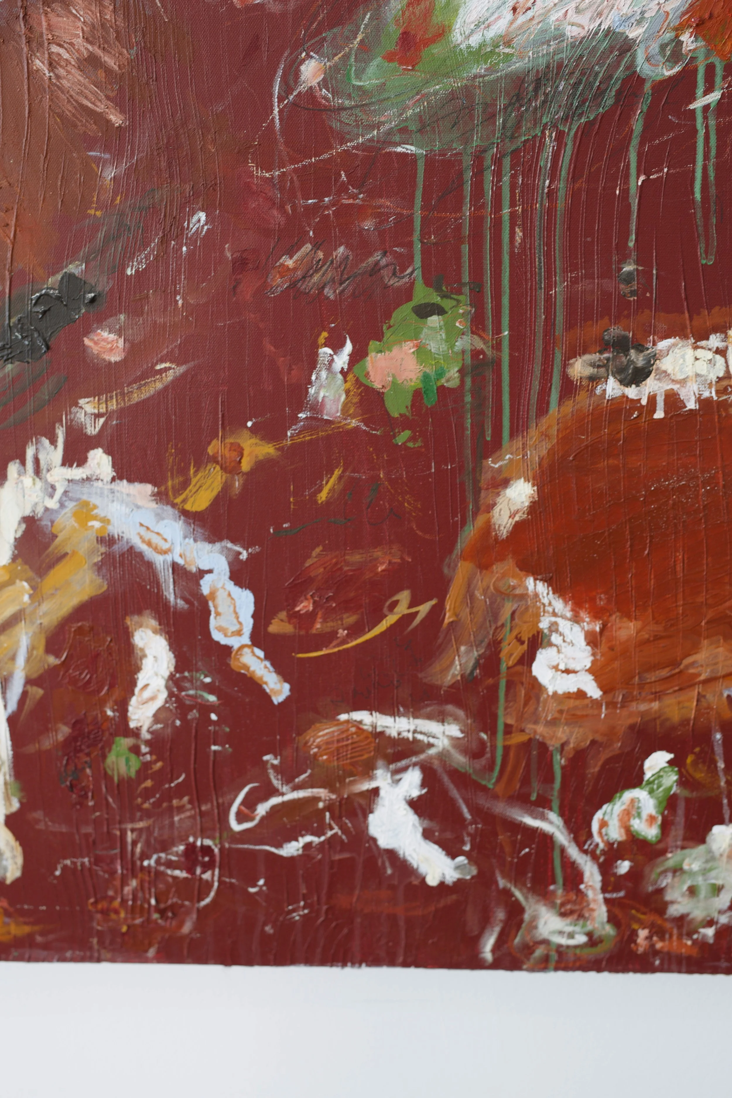 acrylics, oil pastel, oil stick, charcoal and chalk on stretched canvas