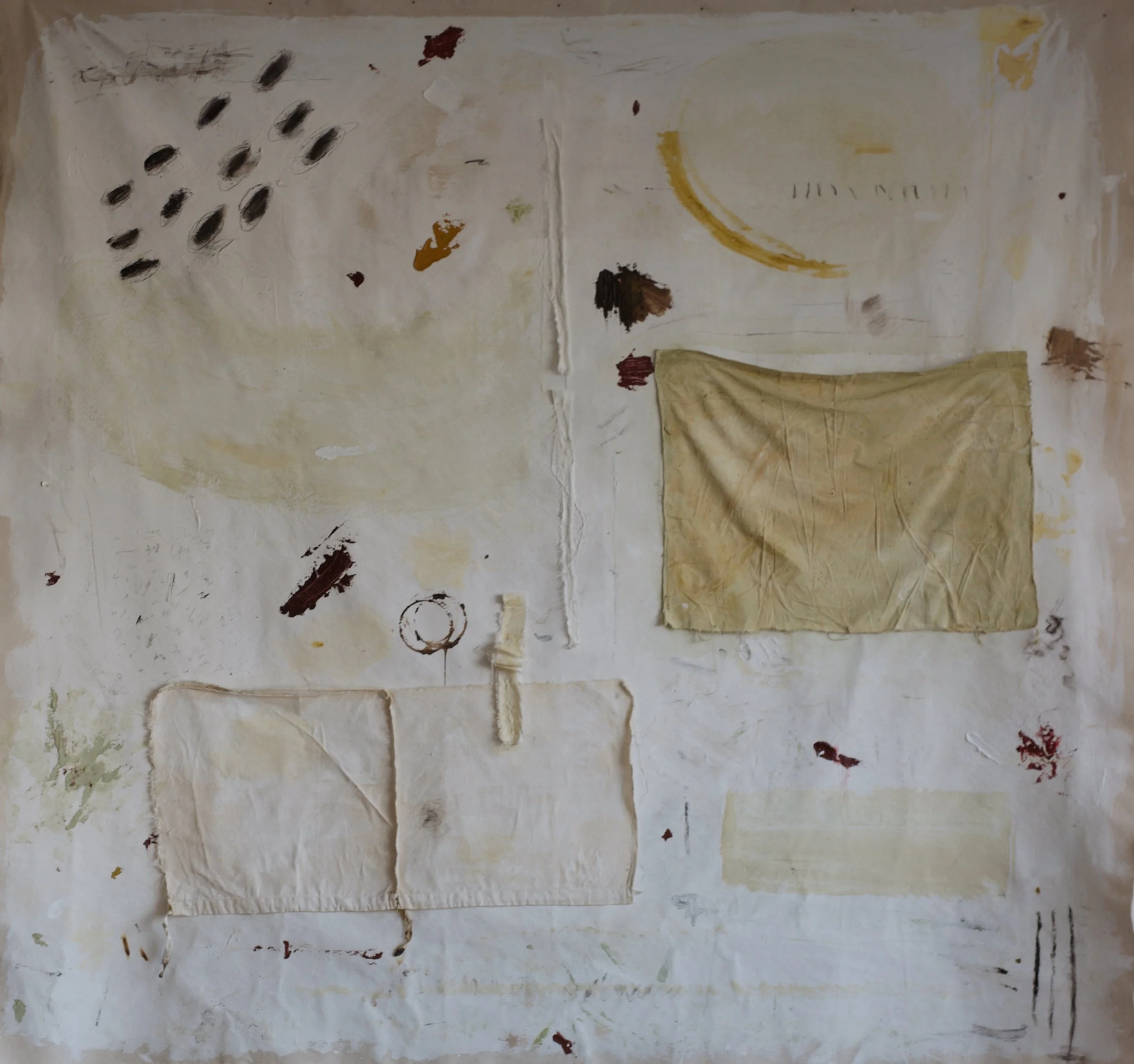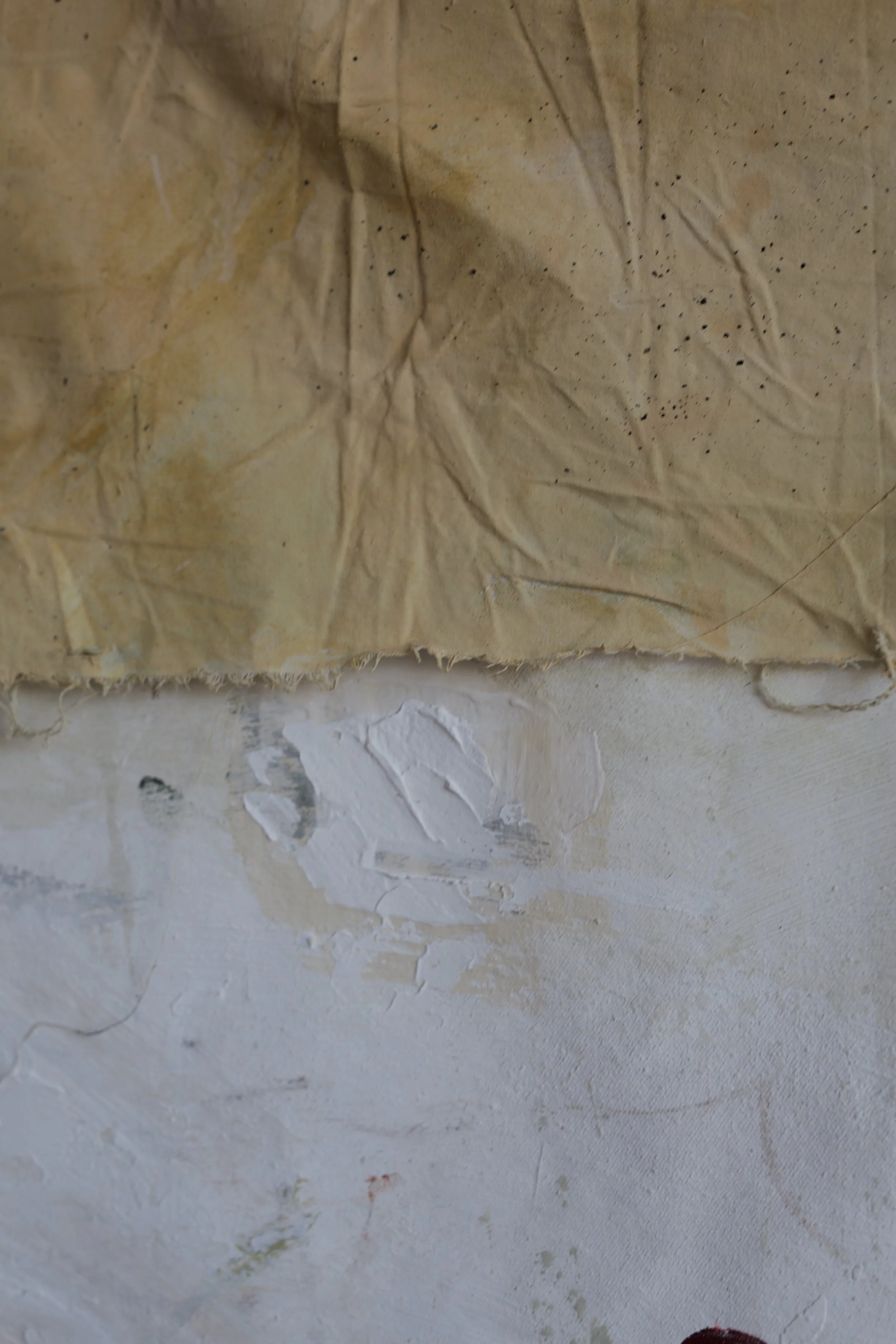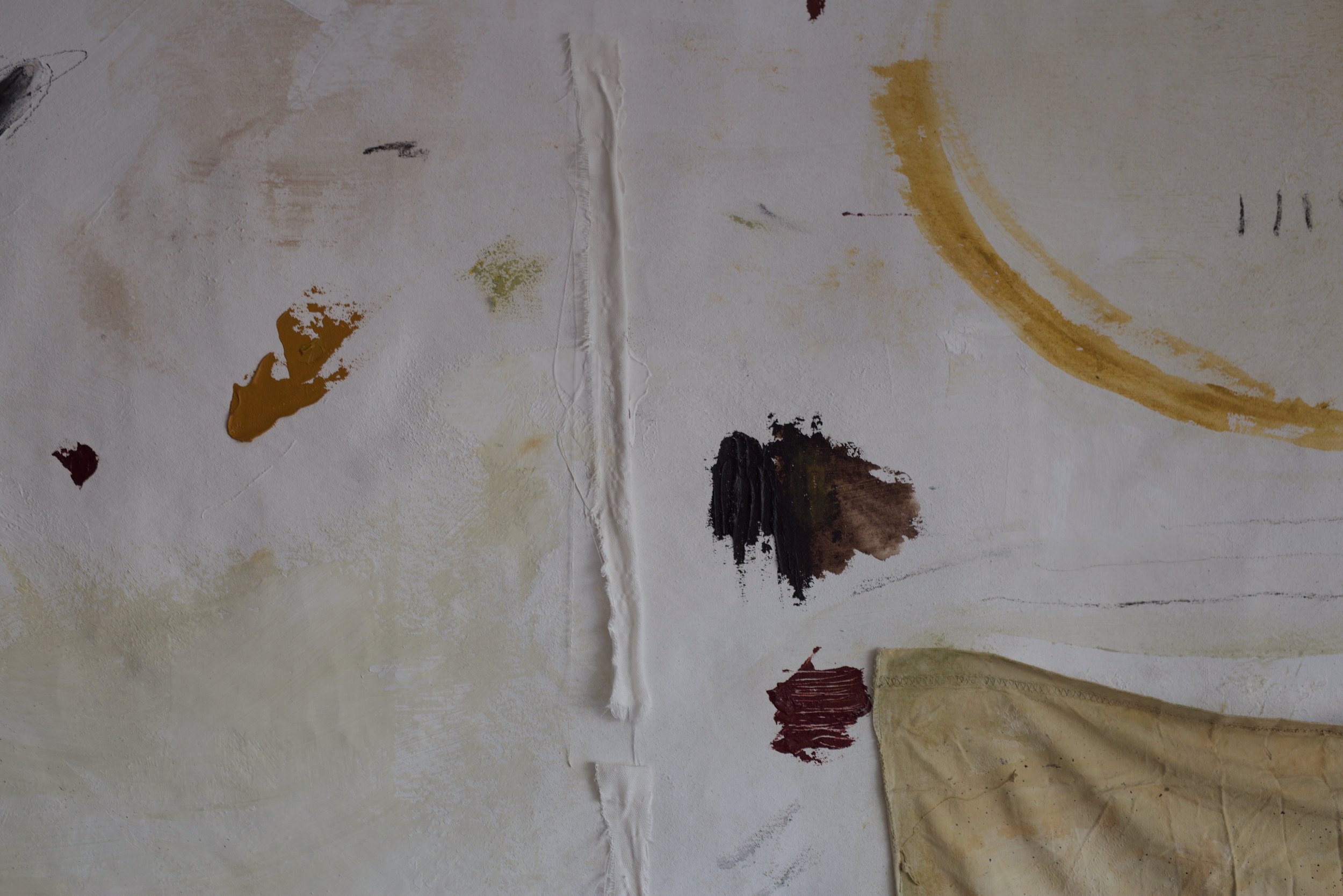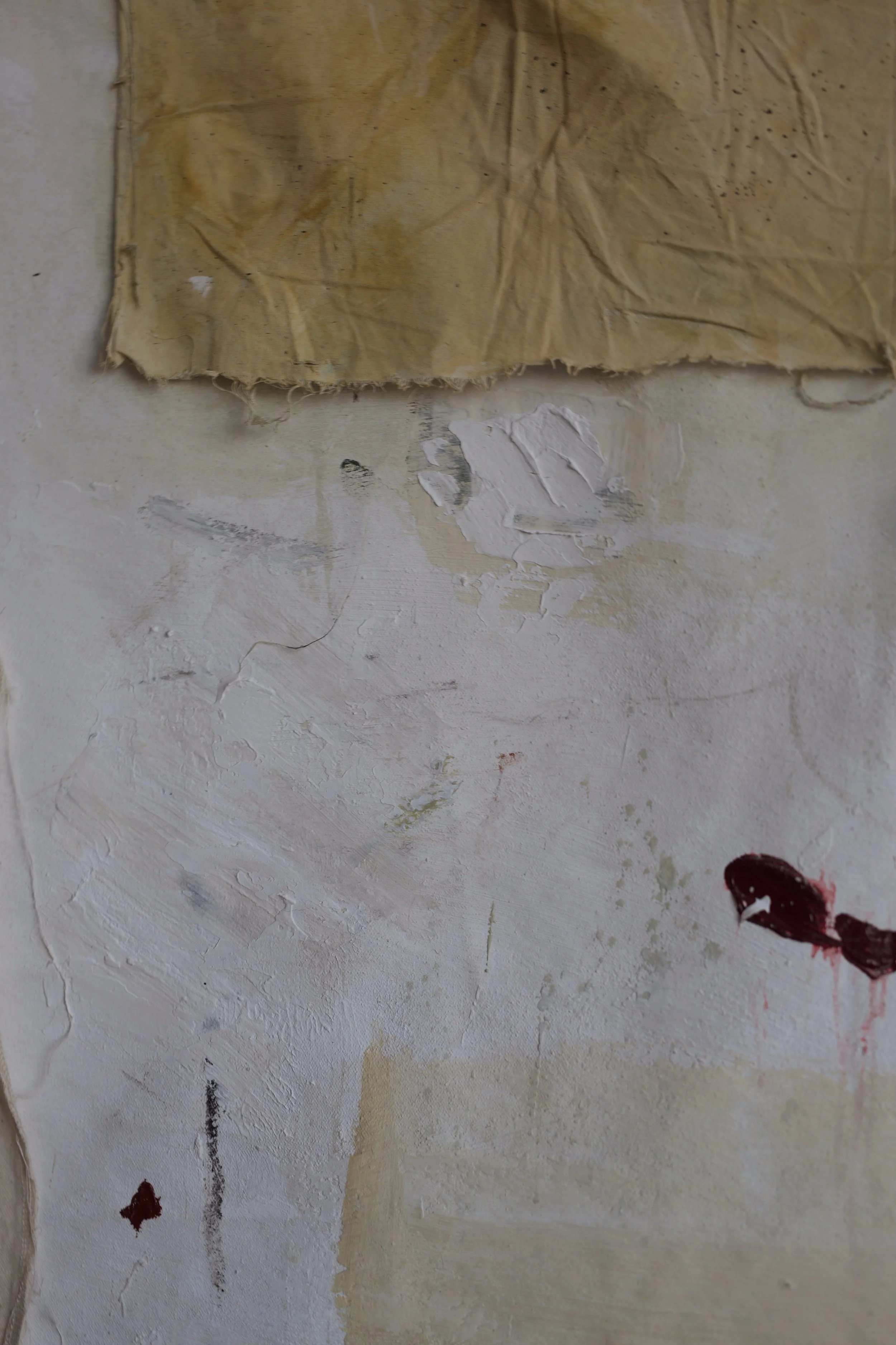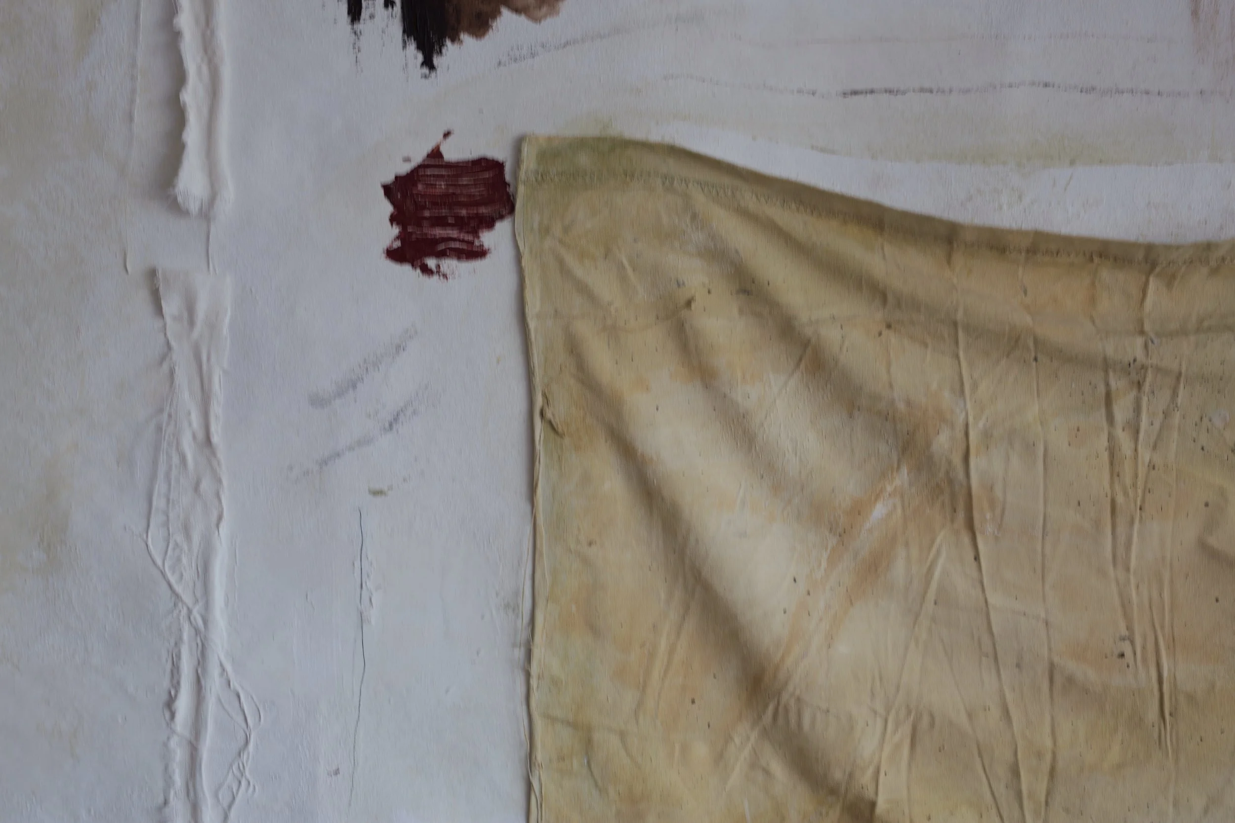 acrylics, treated fabric, chalk, plaster and pencil on canvas