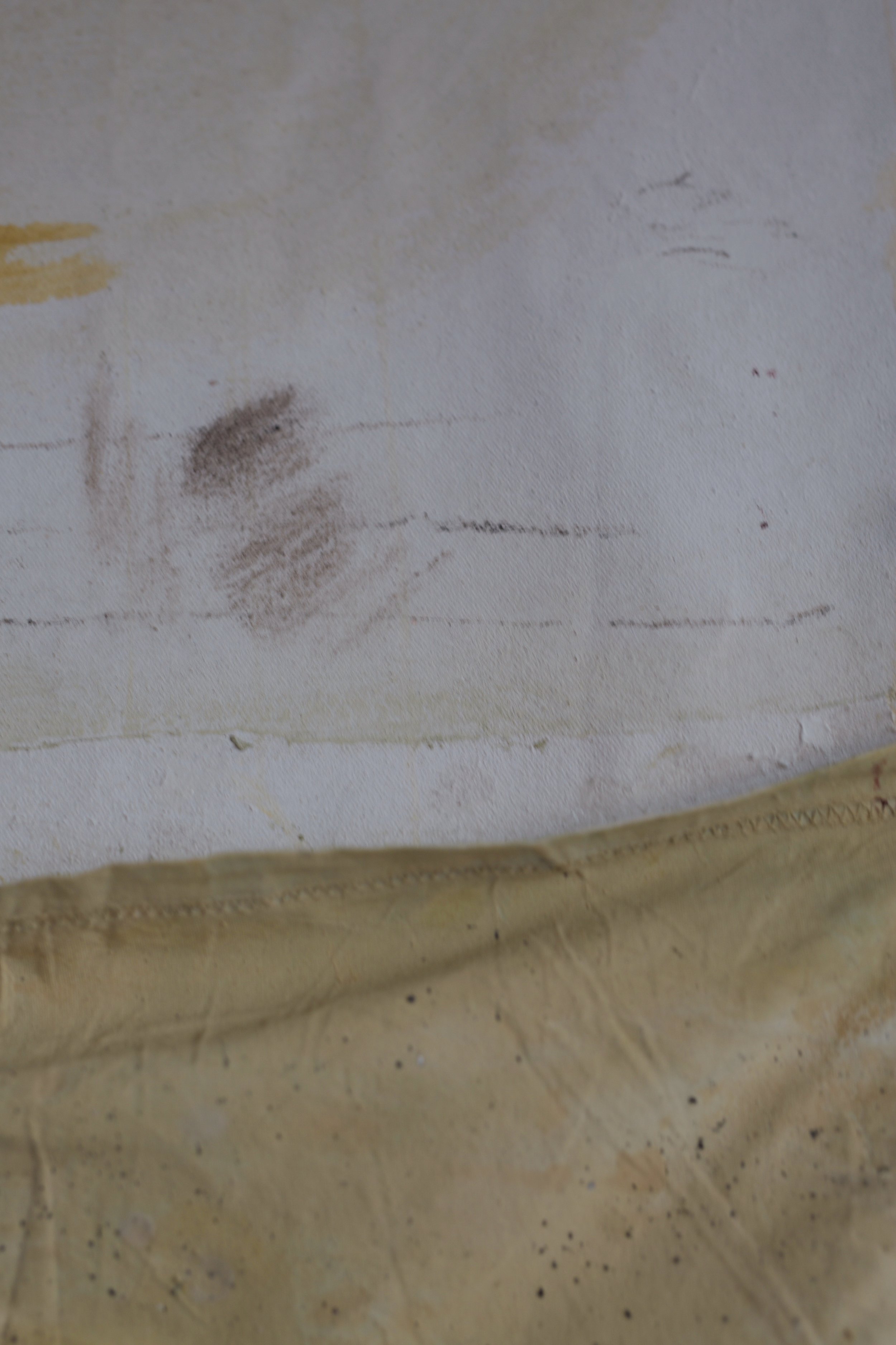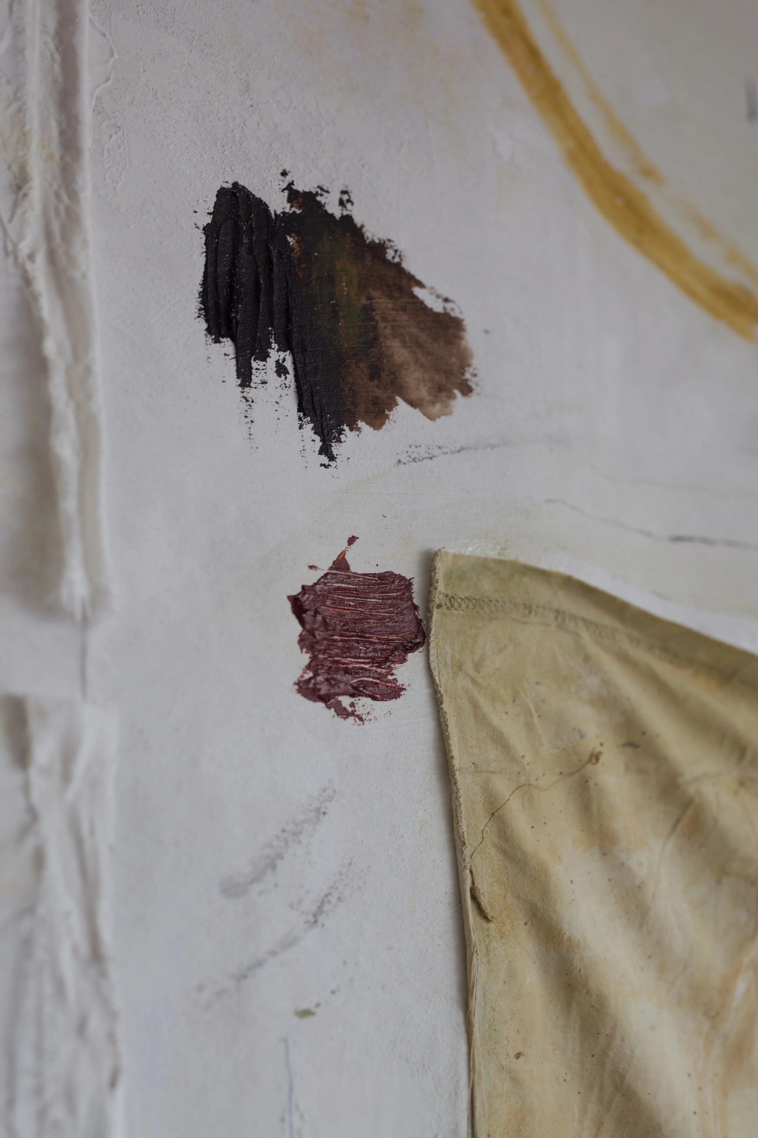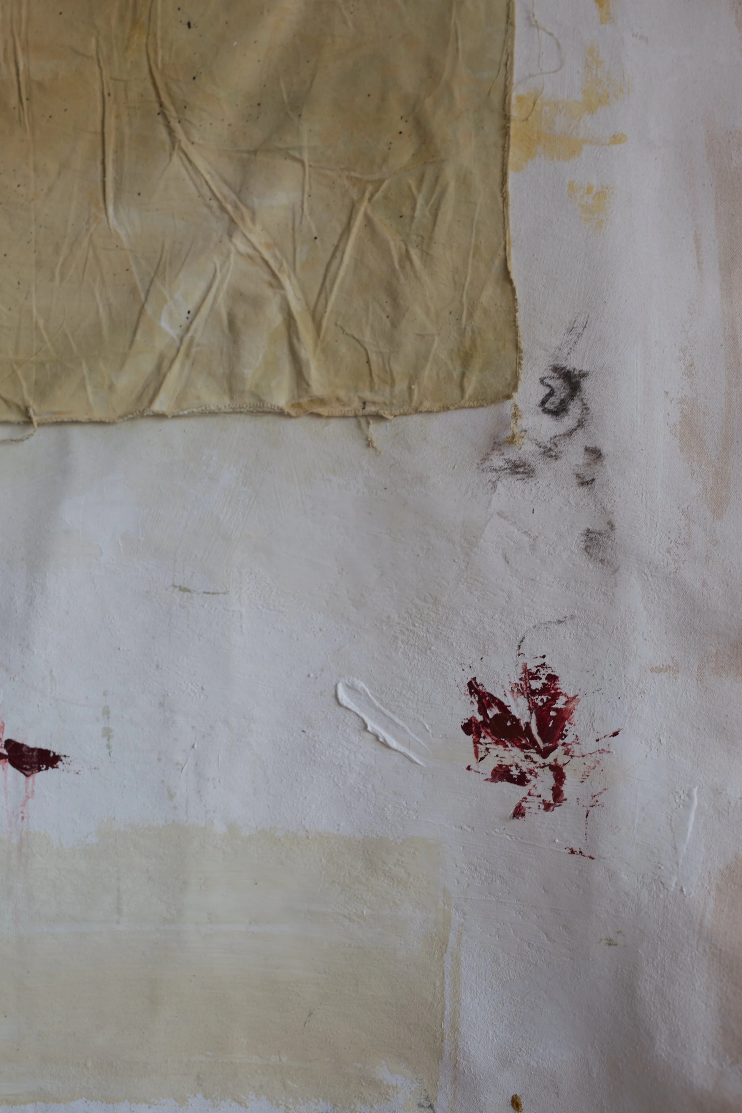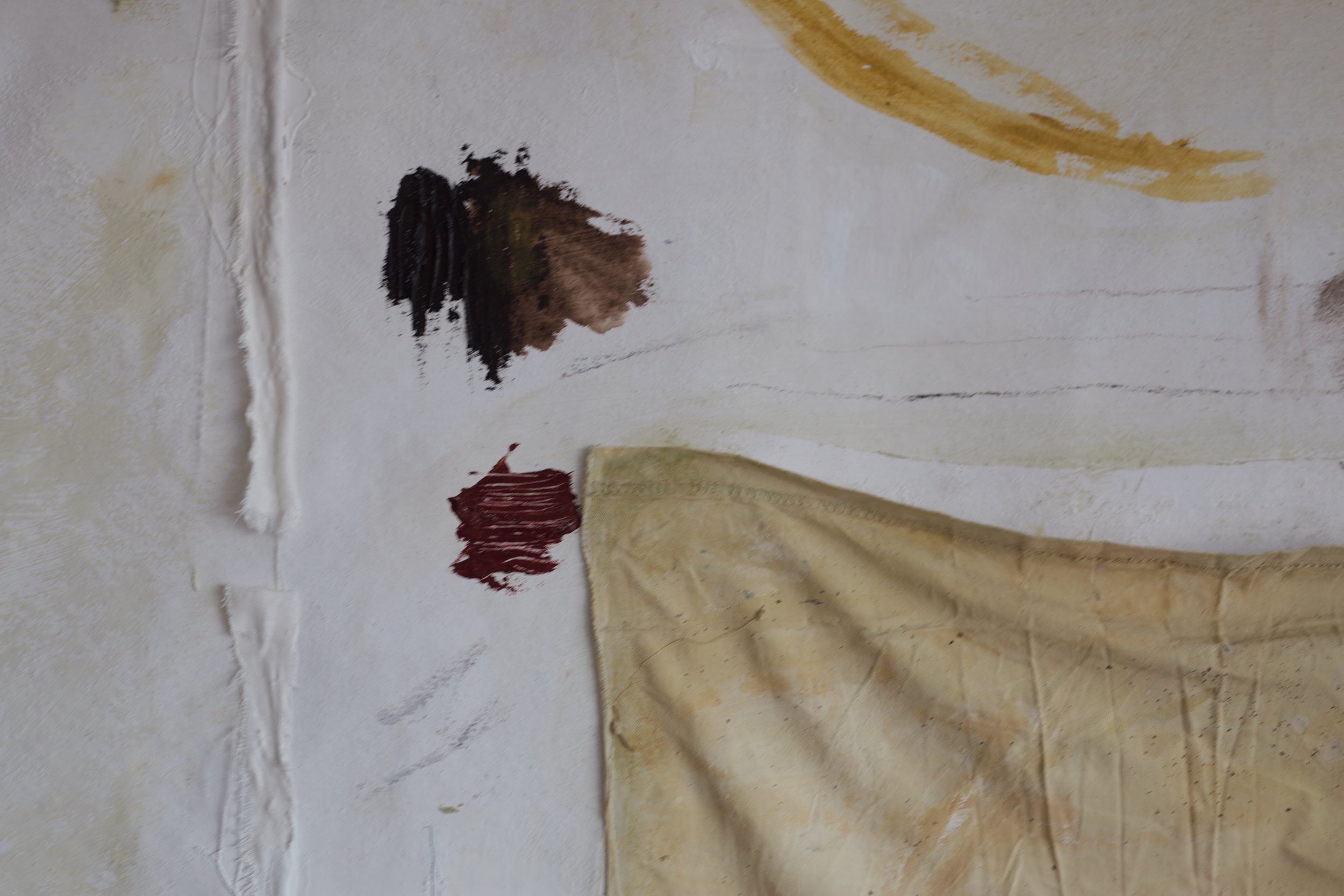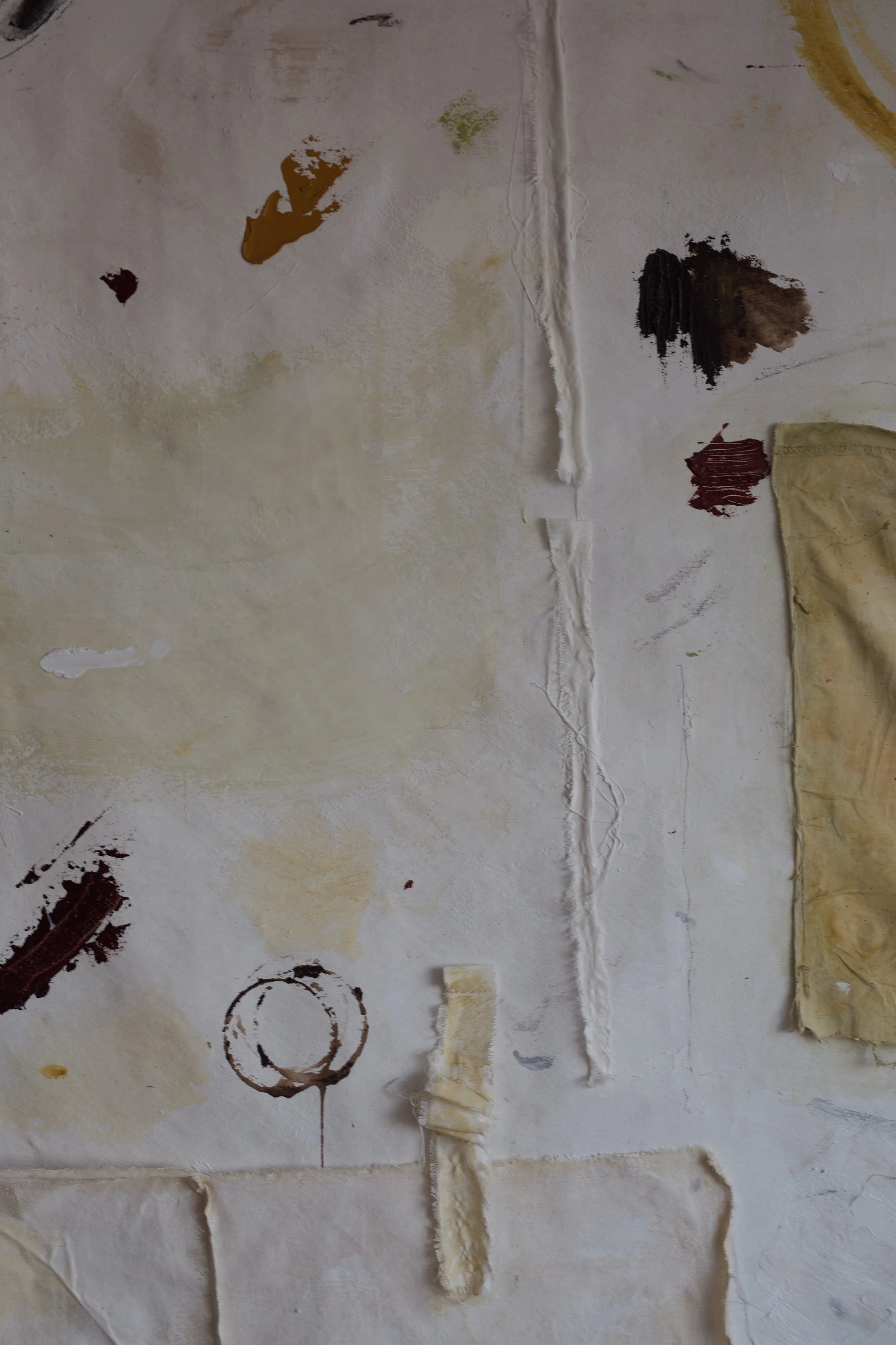 acrylics, treated fabric, chalk, plaster and pencil on canvas