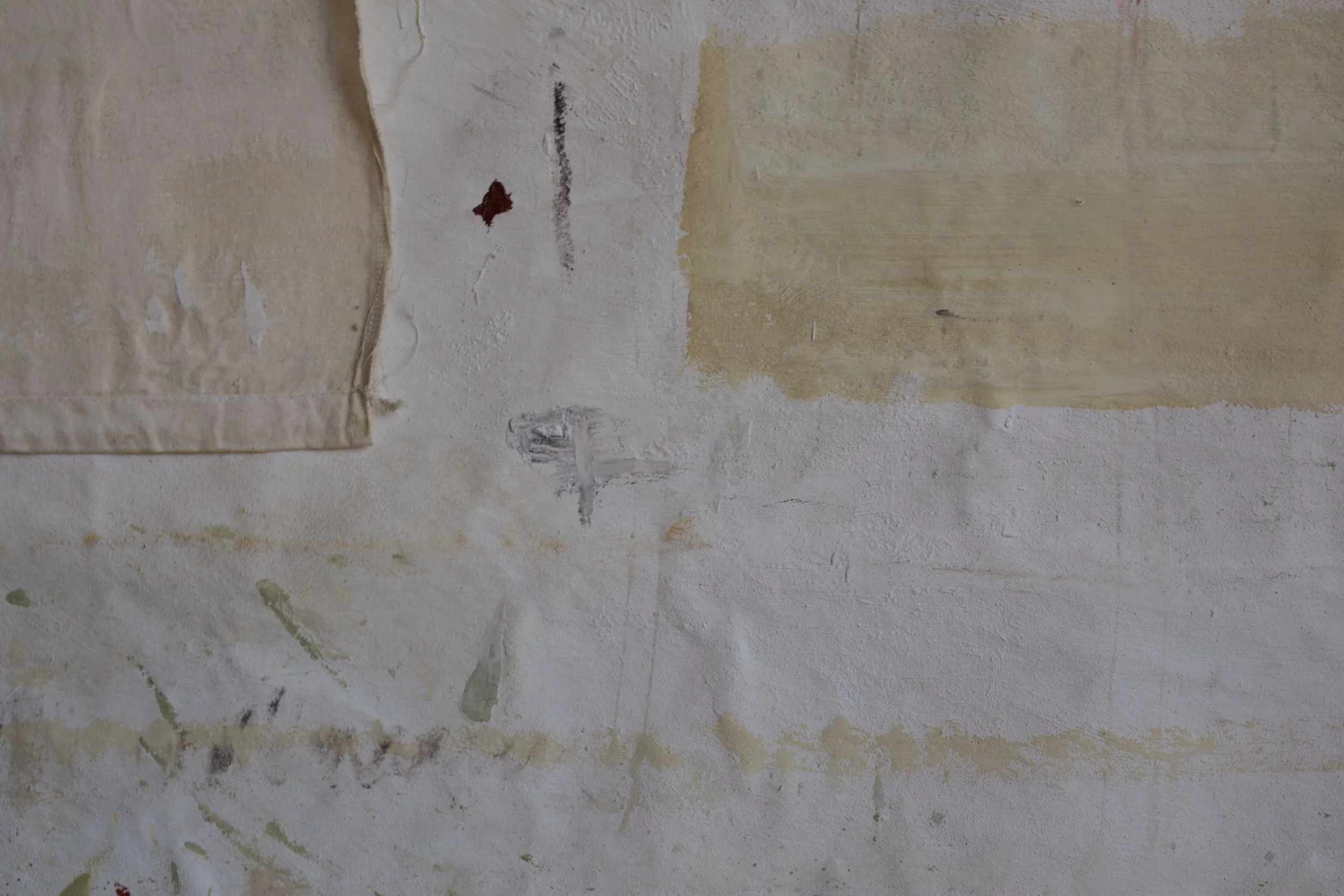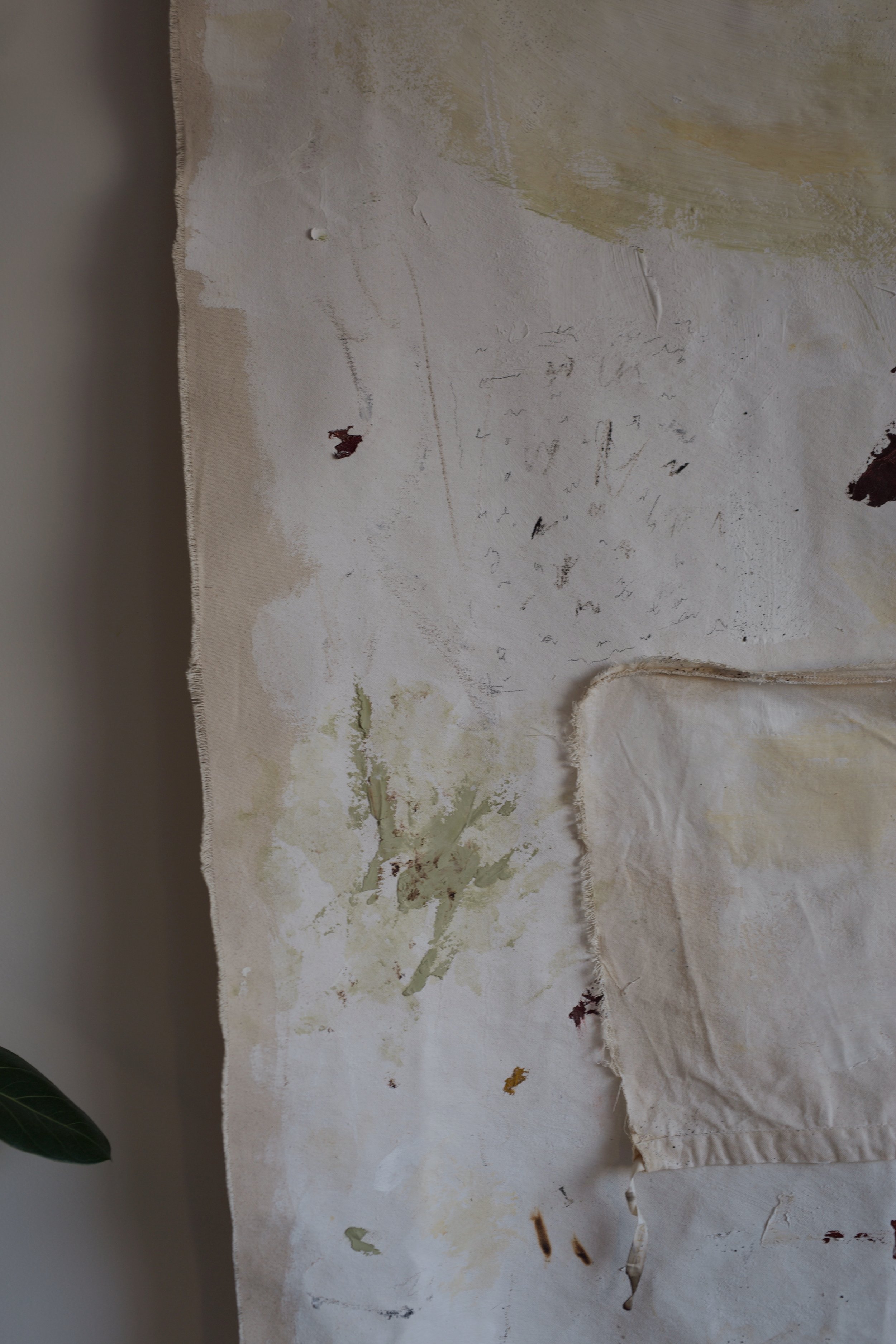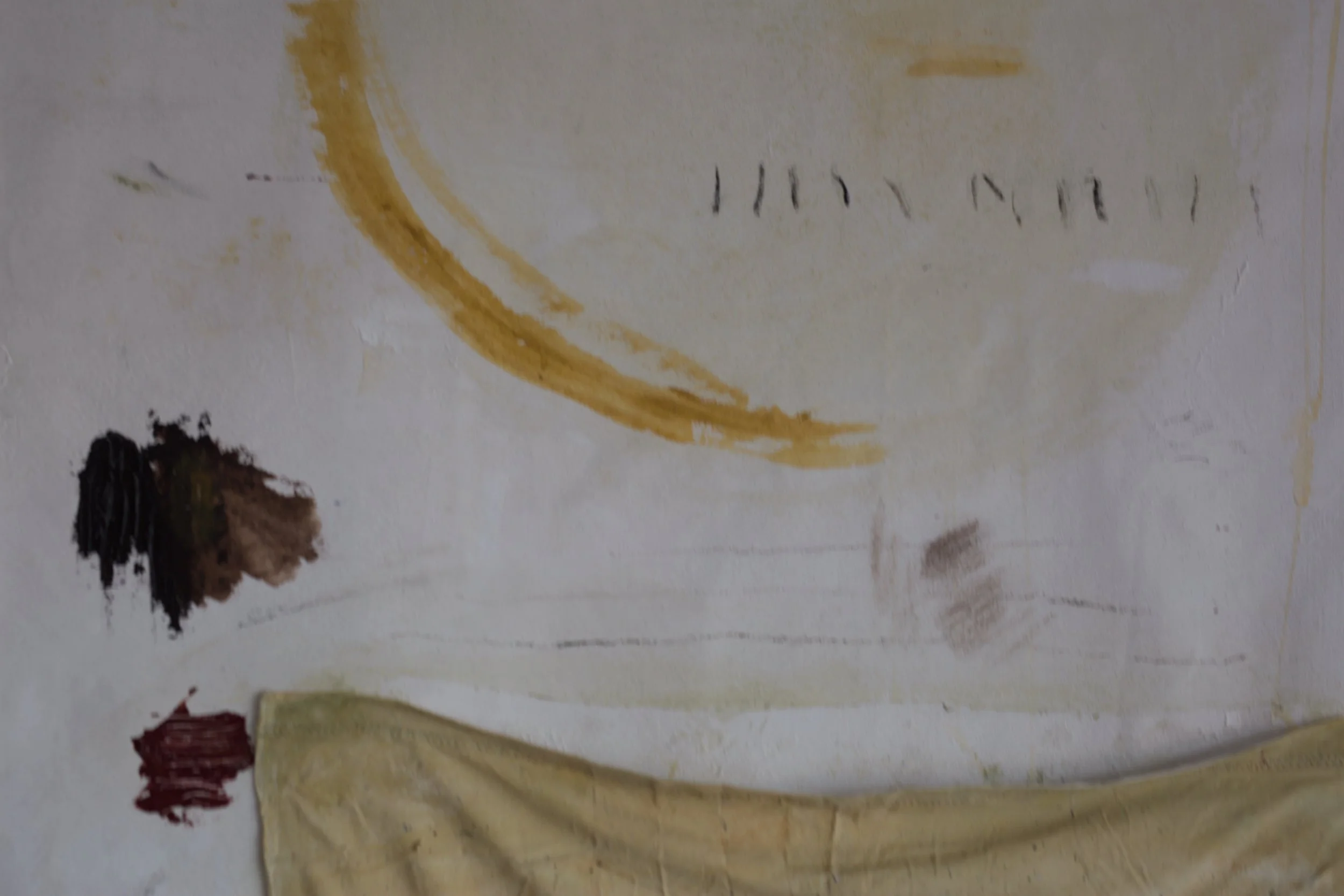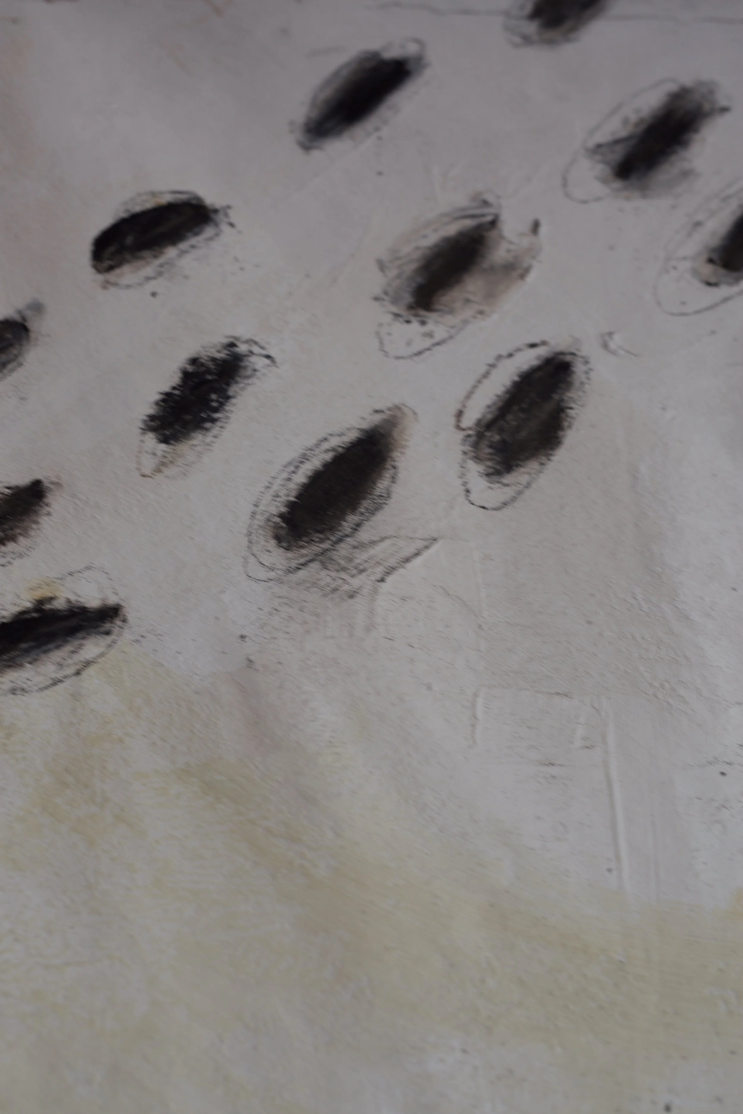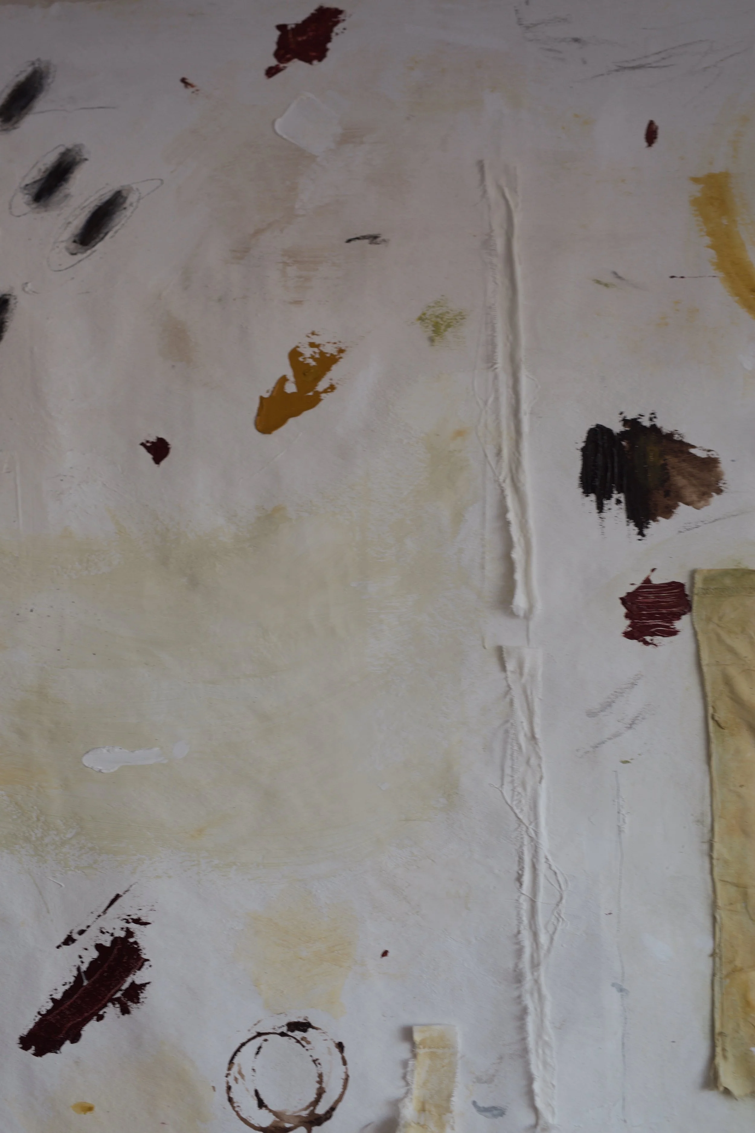 acrylics, treated fabric, chalk, plaster and pencil on canvas