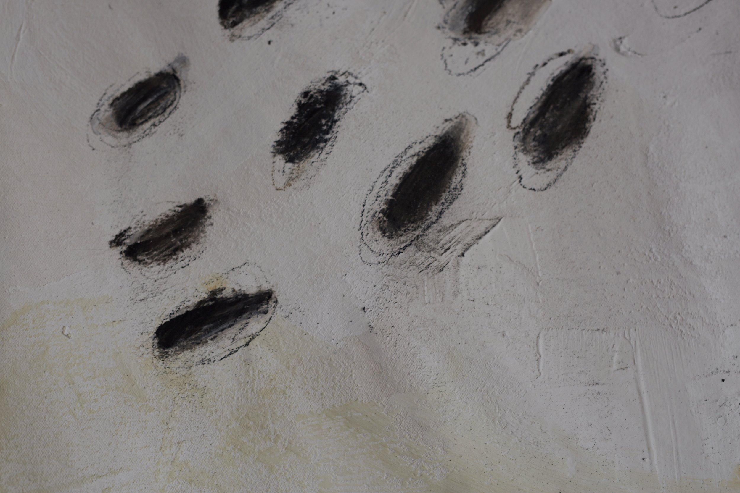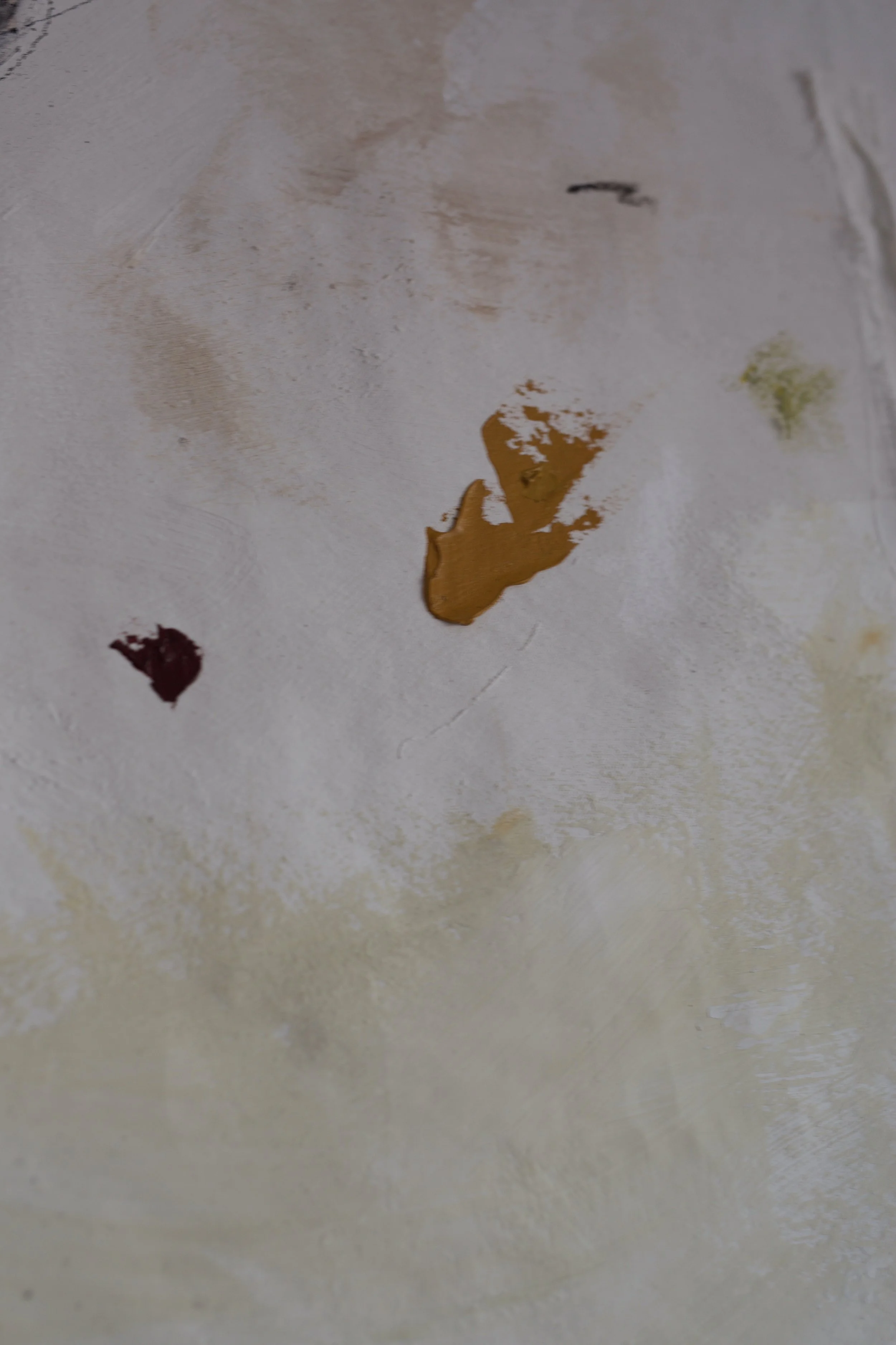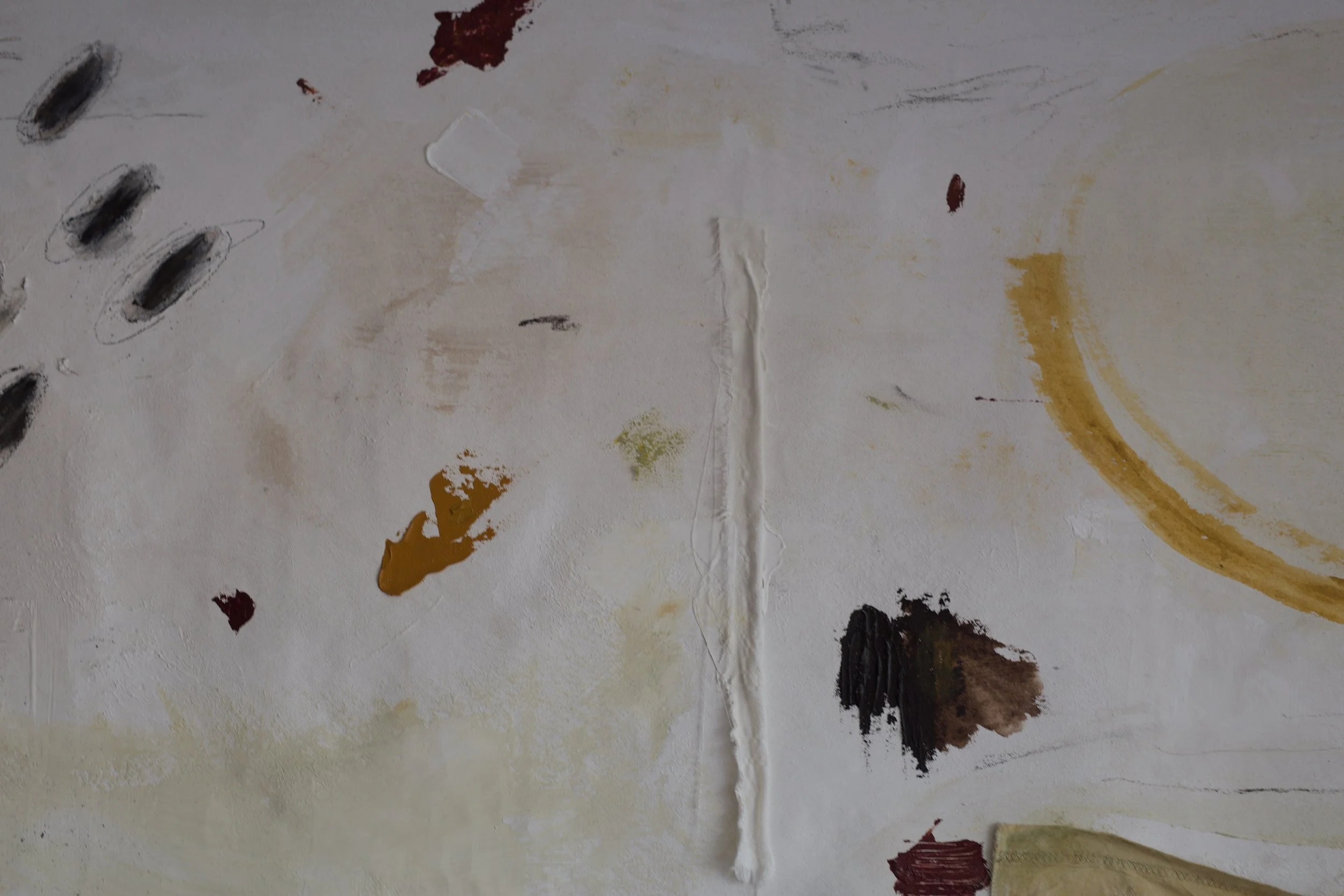 acrylics, oil pastel, oil stick, pencil, plaster and chalk on stretched canvas