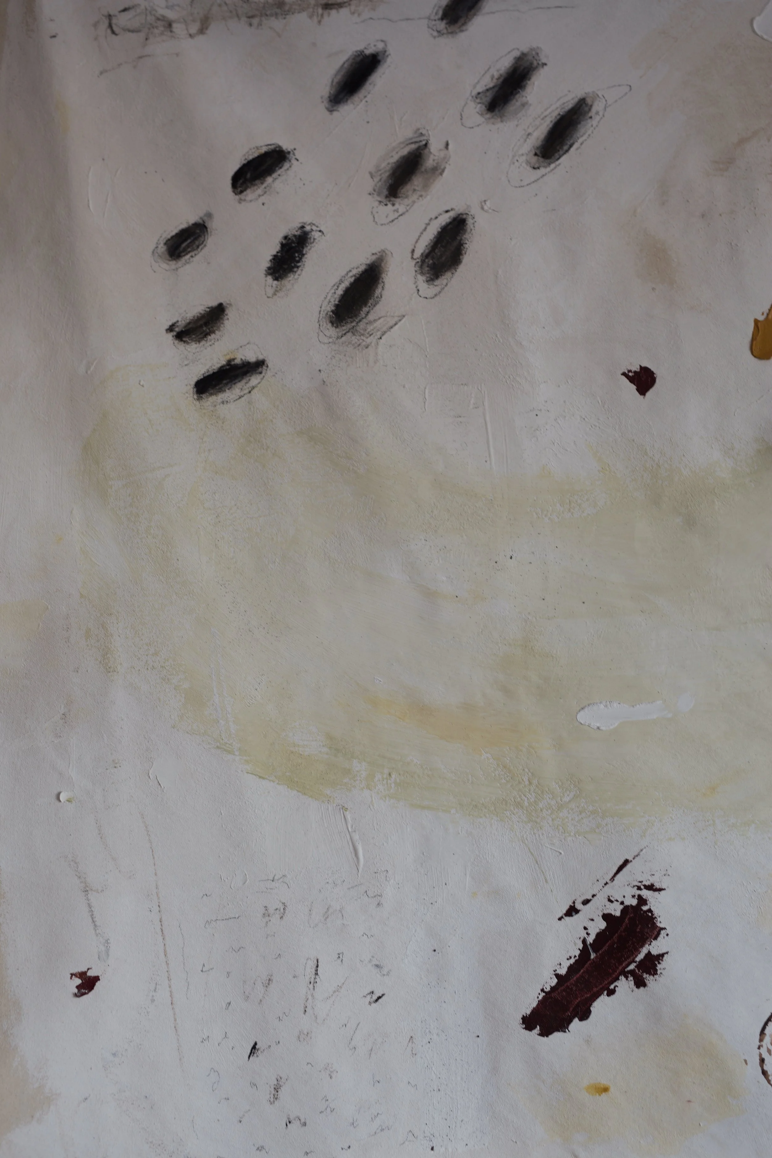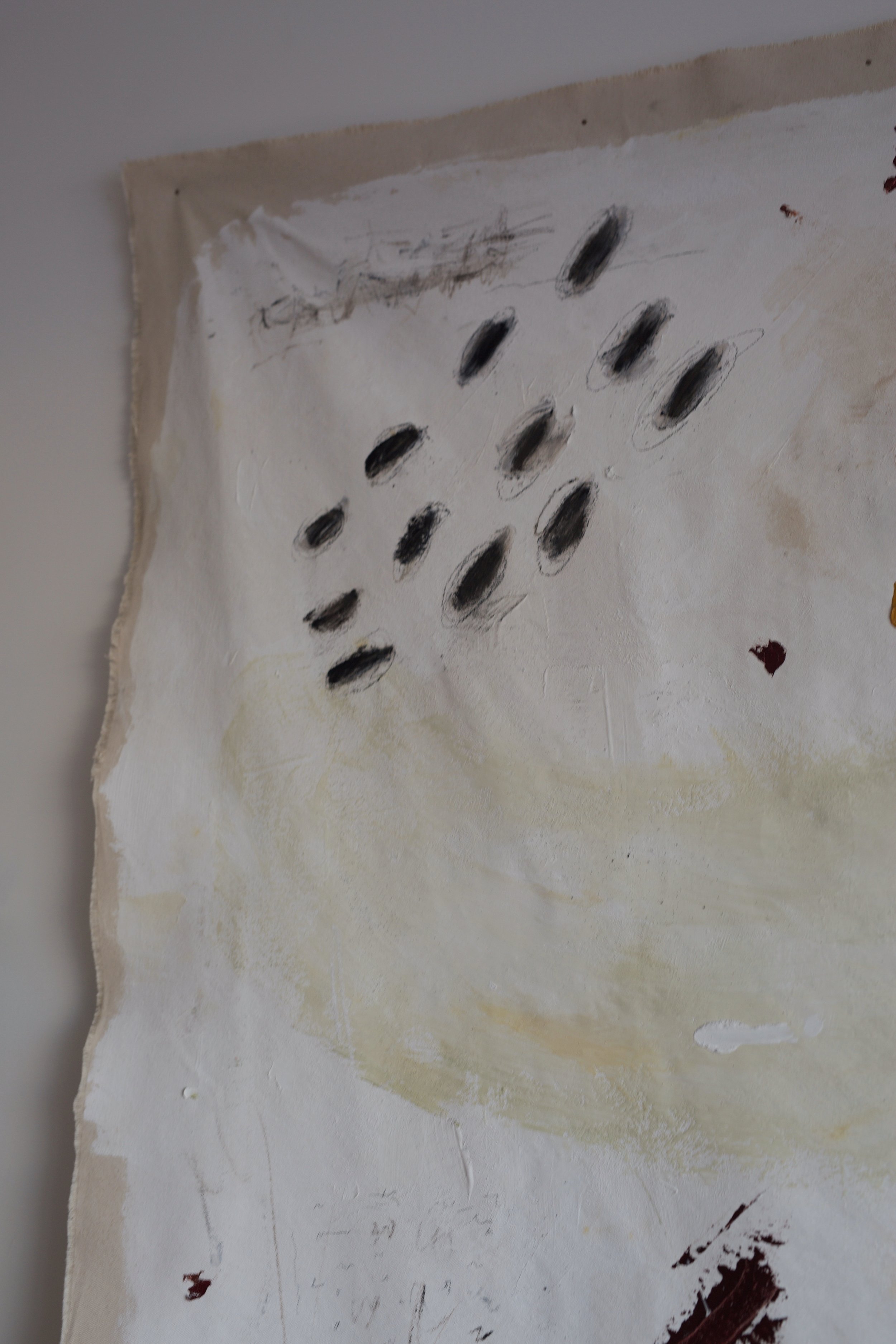 acrylics, oil pastel, oil stick, plaster, charcoal and chalk on stretched canvas
